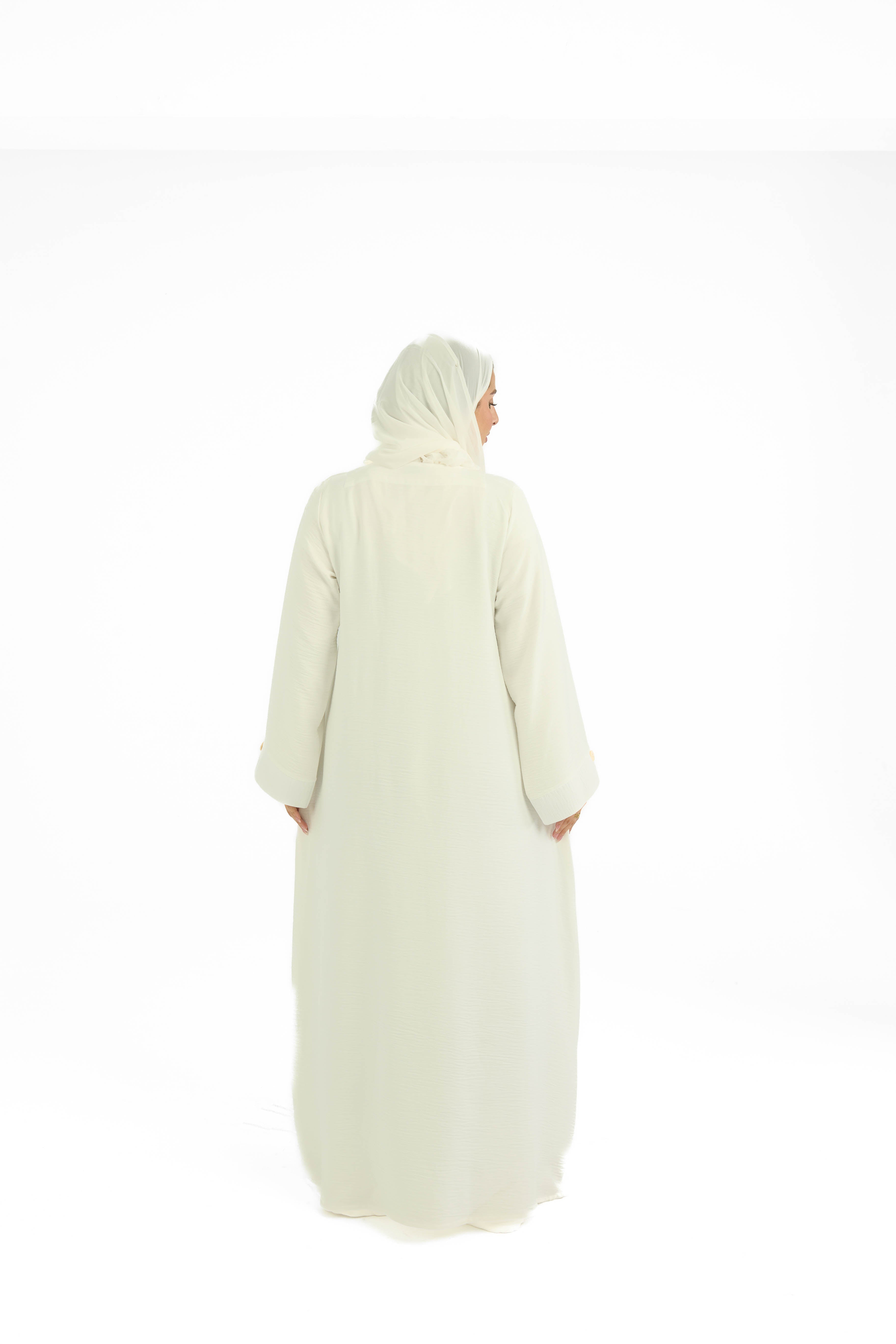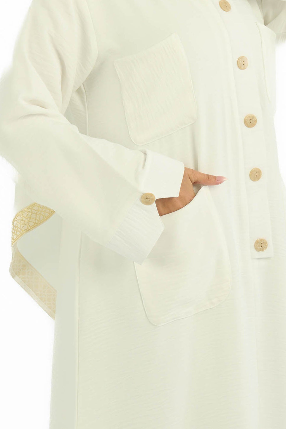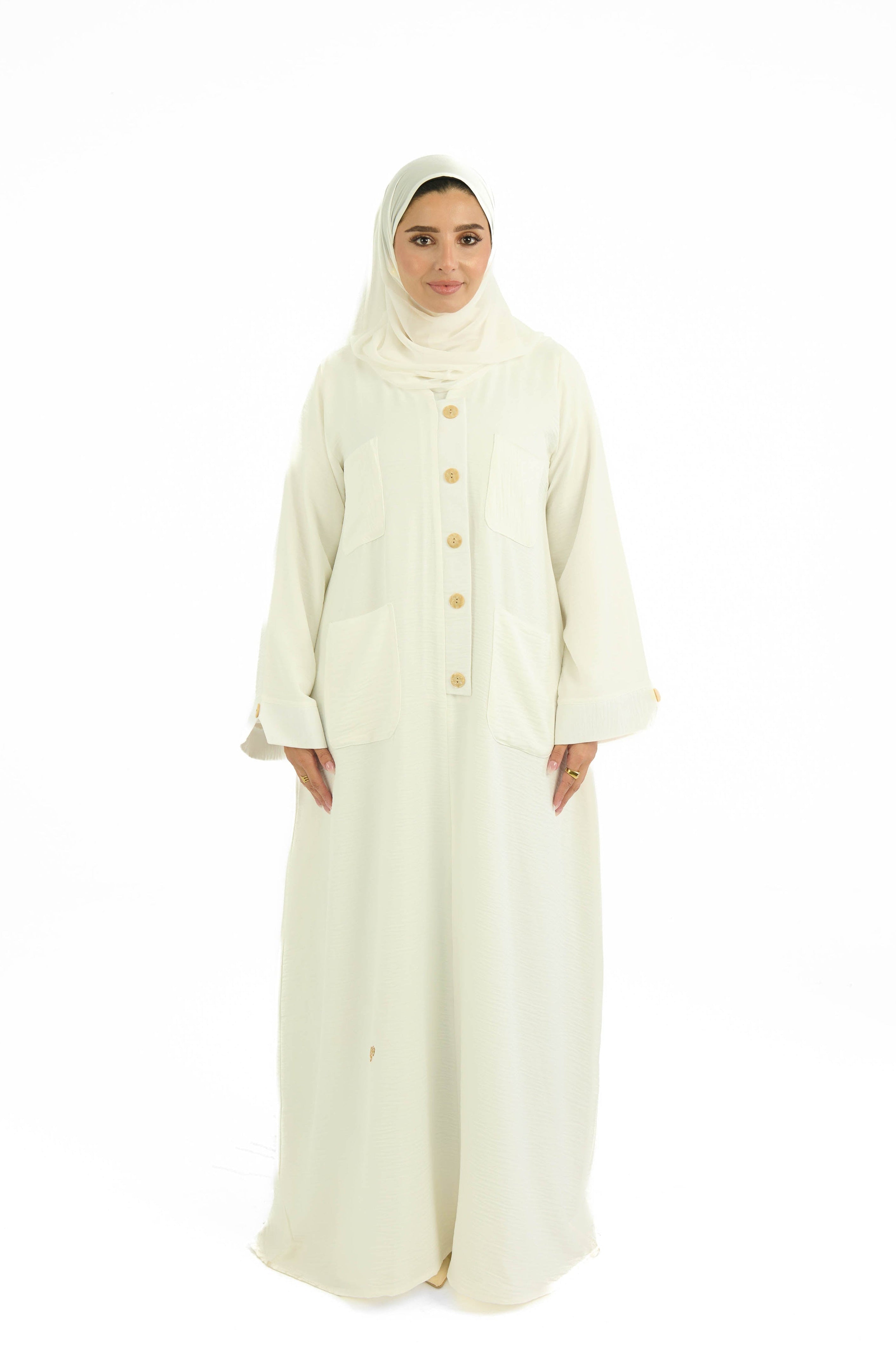 Tailored from premium linen fabric, this elegant abaya exudes simplicity and sophistication. The front button-down design and large patch pockets add a touch of modern practicality, while the wide cuffs complete its refined silhouette. Comes with a matching hijab for a seamless and graceful look.