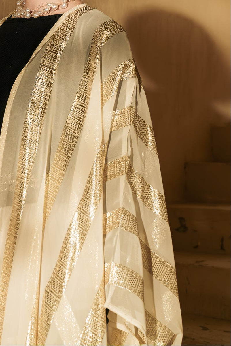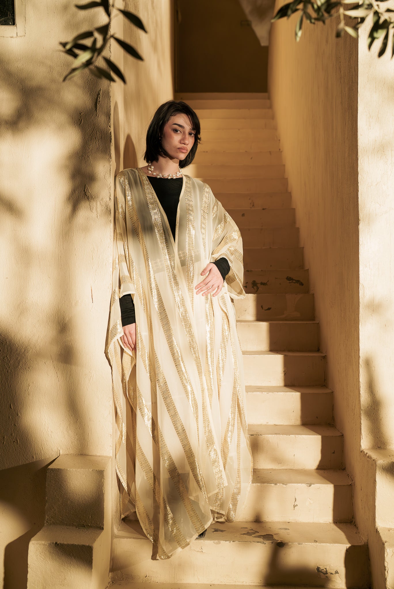 A luminous look with golden stripes that reflect the beauty and spirituality of Ramadan. A loose, comfortable design that flows with elegance, offering freedom of movement with a touch of understated luxury. Follow the care instructions to preserve its delicate shine and graceful drape.