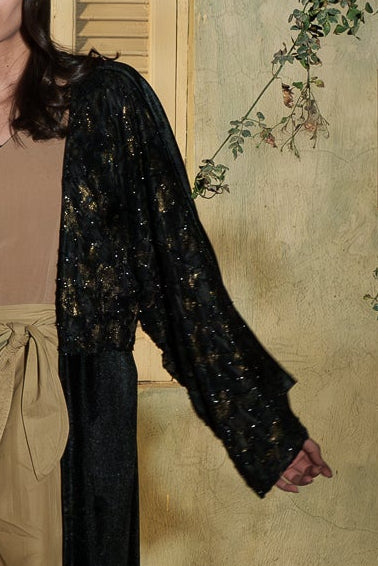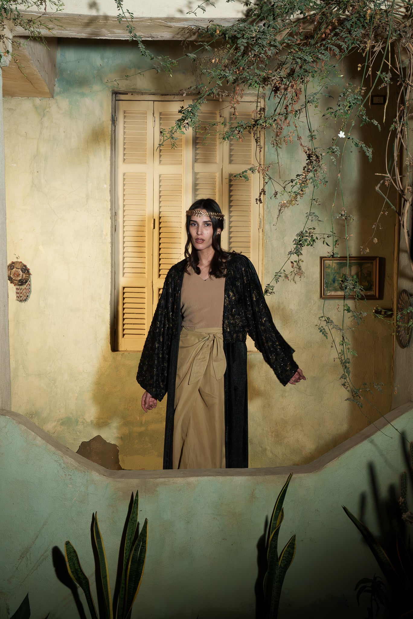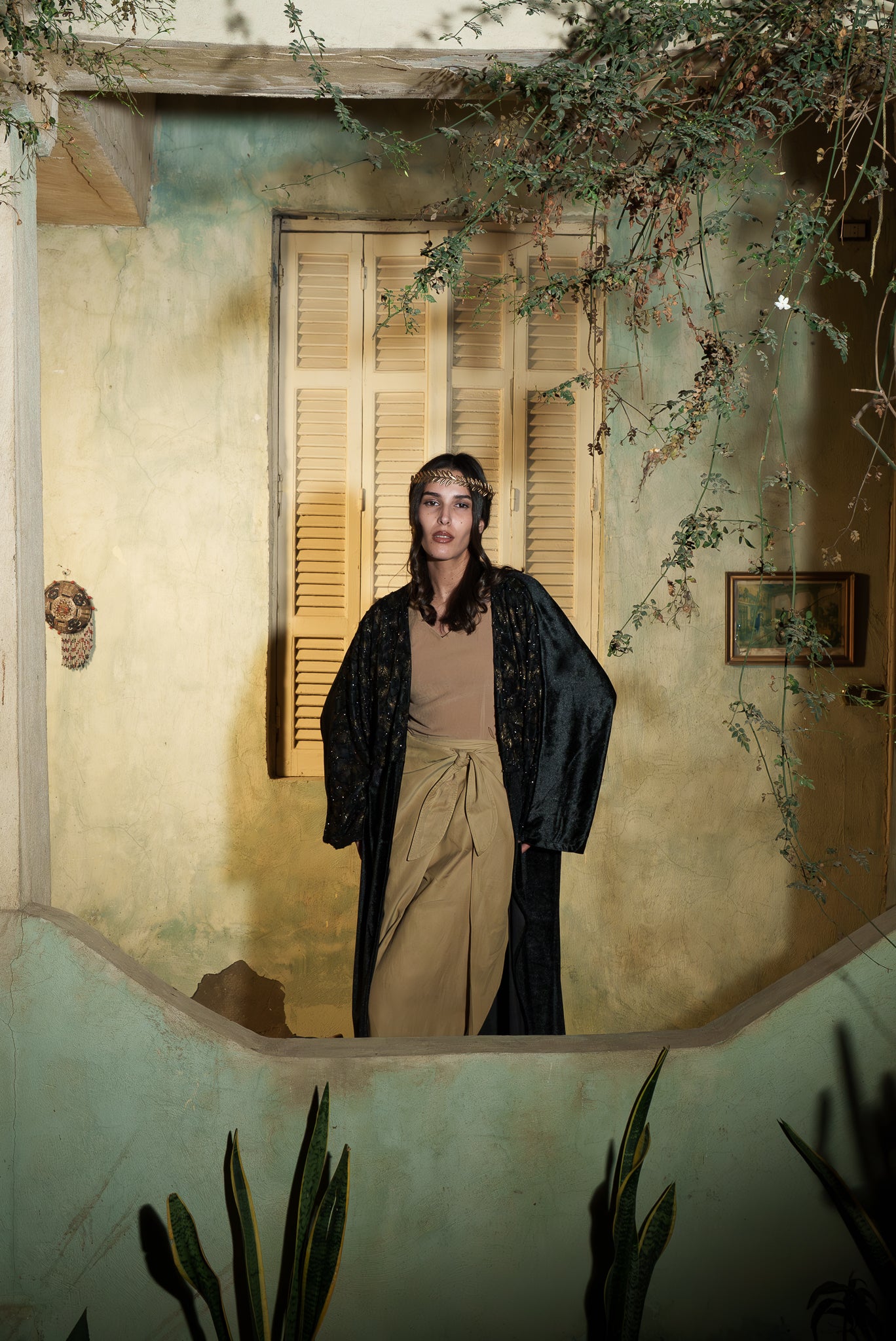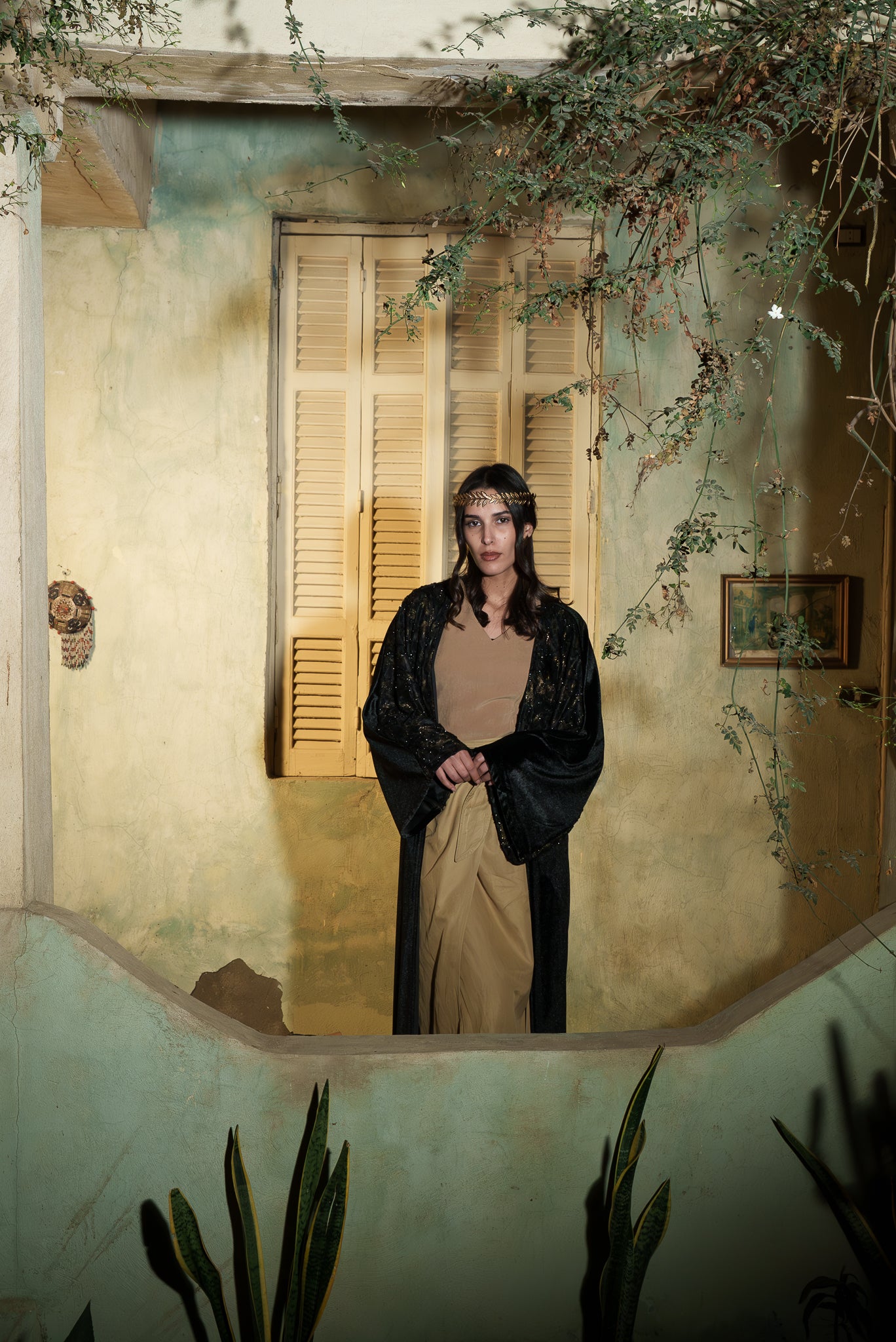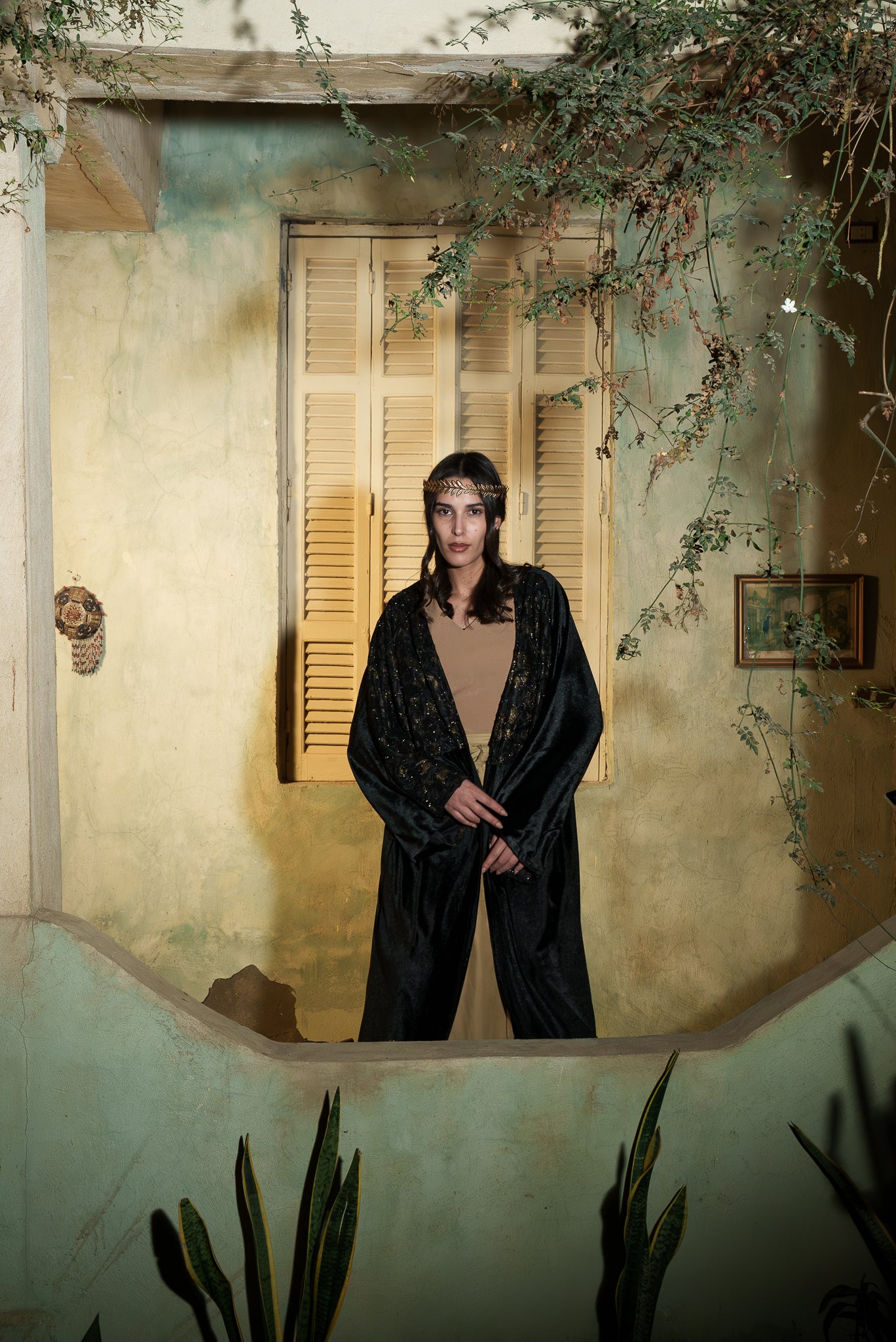 Soft velvet warmth with elegant sequin shimmer on the sleeves that reflects the radiance of Ramadan mornings. An open, loose design that offers freedom and comfort with a touch of refined sparkle that brightens your look. Follow the care instructions to preserve its luxurious velvet texture and delicate sequin details.